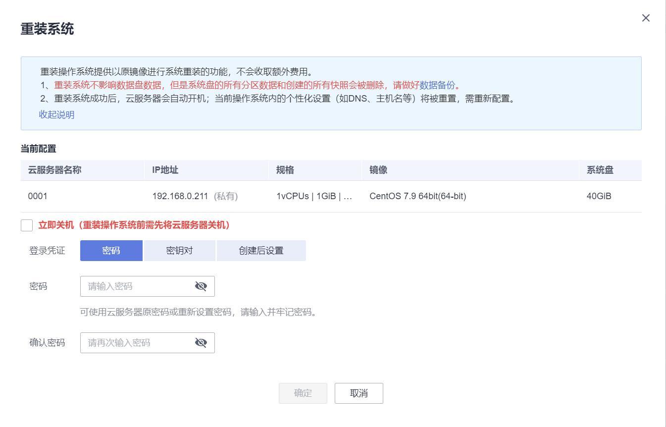步骤二:重装系统时这里需要勾选立即关机,下面要设置一个云服务器登陆密码