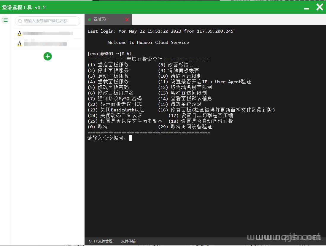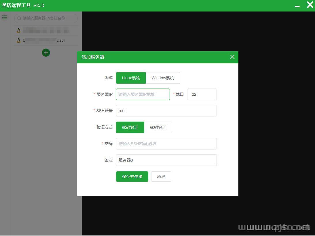 我用的本地软件:堡塔远程工具,这里需要输入服务器IP和密码,密码就是步骤二中设置 的密码,进去后输入如下指令安装系统。