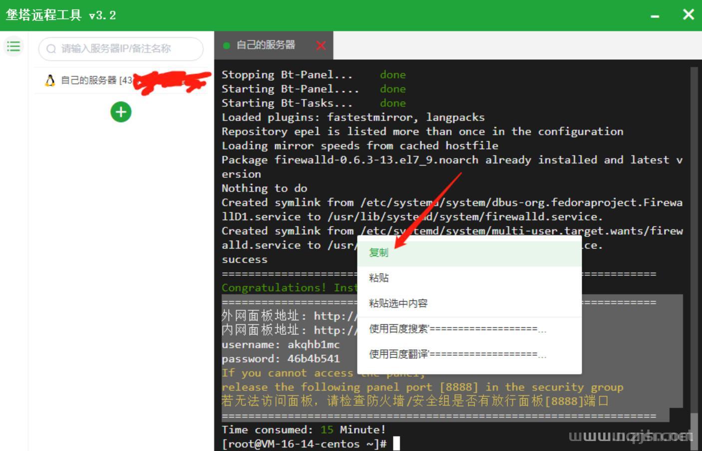 手打这个命令也不容易,可以用鼠标选中复制命令后,打开堡塔SSH终端,鼠标右键粘贴 ,按回车执行。