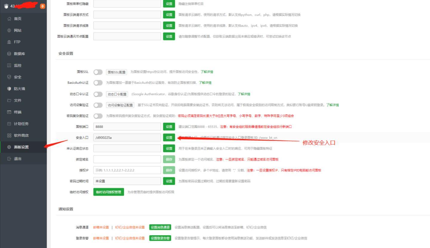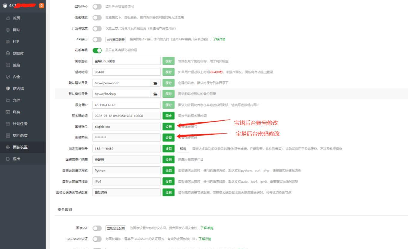 步骤六:宝塔面板修改登录入口,登录账号密码。登录账号和密码可以用远程工具修改,也可以在宝塔登录后的面板设置里面修改,登录路径只能在面板设置里面修改,参下图: